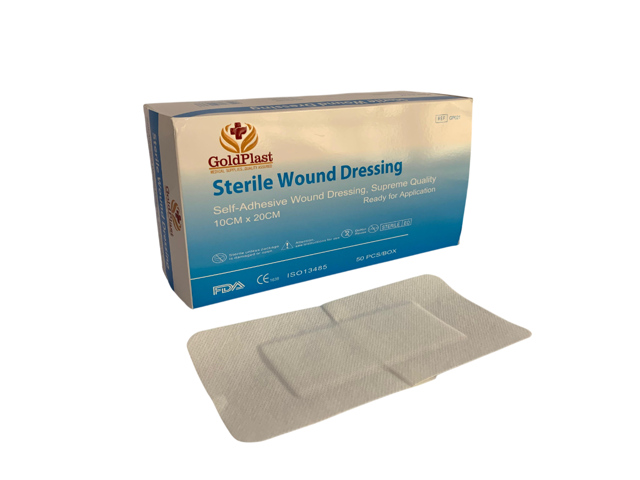 GoldPlast Sterile Self-Adhesive Wound Dressing is an advanced medical dressing designed to provide safe, hygienic, and efficient protection for a wide range of wounds. It features a sterile, absorbent central pad that gently covers the wound and helps absorb exudate, while the surrounding self-adhesive border ensures secure fixation without the need for additional tape or bandages. The dressing is available in multiple sizes and shapes to accommodate different wound types, from small cuts and abrasions to post-surgical incisions, making it highly versatile in clinical and home care settings. Its breathable backing allows air circulation to support natural healing, while still acting as a protective barrier against bacteria, dirt, and external contamination. The hypoallergenic adhesive is designed to be skin-friendly, reducing the risk of irritation even during prolonged use or frequent dressing changes. Because of its ease of application, comfort, and reliable protection, GoldPlast Sterile Self-Adhesive Wound Dressing is widely used in hospitals, clinics, and first-aid kits as a dependable solution for modern wound care management.